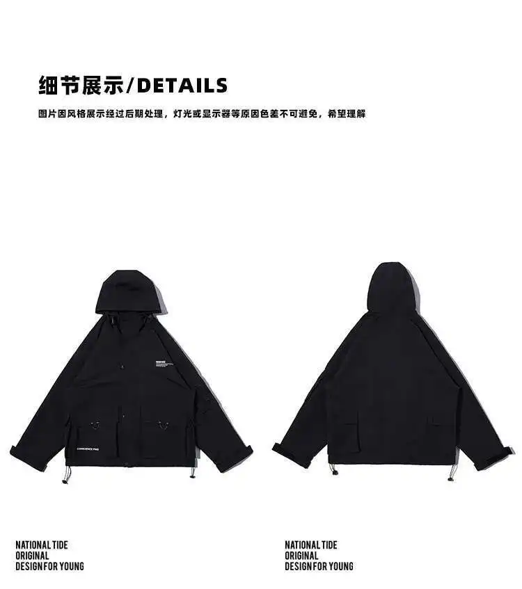 Guochao functional style men's loose fashion brand ins jacket spring and autumn Multi Pocket hooded frock coat fashion